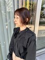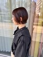 外ハネのミニボブスタイルです。襟足ギリギリが可愛いです◎イノアのオイルカラーを使ってブラウンにパープルを入れて艶感アップ!アイロンで外ハネにしてオイルスタイリングで仕上げてます♪