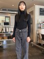 少しモードな黒髪ロングスタイル適度な薄さの前髪とシンプルなロングスタイル、赤いリップが相性良しです。