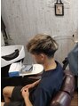 マッシュフォルムからのサイドと後ろを高く刈り上げ前方に向かって重さを残しつつ毛先で既存のカラー部分を残すことでより立体感のある形が残せます。