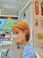 1ブリーチカラーでオレンジカラーです。暖色系カラーはどのベースからでも比較的挑戦しやすいお色味になります◎退色過程まで長く楽しめるのであまり美容室に頻繁に行けないよーってお客様にもオススメになります。カットはライン感が可愛いボブにしました