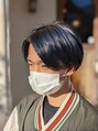 メンズのブリーチスタイルになります。ブリーチしたあと、少し濃いめのネイビーブルーで染めてます!!1枚目が室内光で、2枚目が自然光になります。光の当たり方で見え方も少し変わり楽しんでいただけるスタイルとなっております♪