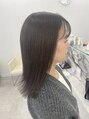 切りっぱなしの、乾かしてオイルをつけたただけで決まるスタイルです。オリーブ系を暗めに入れて、艶や透明感のある落ち着いたアッシュ系のからーにしています。