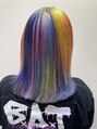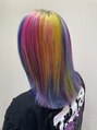 ケアブリーチで全体を明るくして、イエロー・ピンク・パープル・ブルーの4色をランダムに入れました☆派手髪好きさんなら一度はやってみたいユニコーンカラーです!オススメです!
