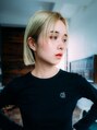 今流行りのブロンドヘアに切りっぱなしのスタイルになっています。前髪をセンターから分けて頬骨を隠すことで小顔見えになります。後ろの毛先のプツッと感を作り耳にかけることで首元がスッキリしてきれいな印象になります【ブリーチ/ボブ/ショートカット】