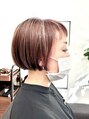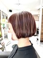 襟元2センチを刈り上げてより小さなシルエットのミニボブ。あまり動かさないスタイルなので、ハイライトとピンク系のカラーで立体感とツヤをだしました。