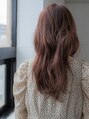前髪は少し目にかかるくらいに設定することで 少し大人の色気のある印象を作り出すことができます。 全体は、1ブリーチ後ほんのりピンクをいれたグレージュにすることで トレンド感も感じる透明感の溢れるカラーに。 ラフに巻くだけでこなれ感を出せます
