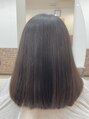 鎖骨レングスのミディアムローレイヤー。カラーと同時施術の酸性トリートメントで髪に優しい薬剤でツヤのある質感に。8トーン・フォギーベージュカラーで赤みを抑え落ち着いた仕上がりに。