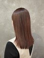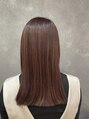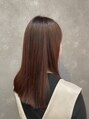 カットはセミロングで毛先を切り揃えた重めなスタイルです。厚みを残してあります。カラーはピンクとレッドを合わせて色味が濃く出るように、トーンは上げずに色味を乗せました。