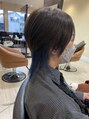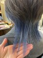 インナー部分は白っぽくなるまで抜きます。ブリーチ必須のインナーカラーです。その後インナーに鮮やかブルーをオン!ウルカットも極限まで高低差をつけたモード感なウルフショート