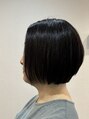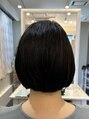 前下がりのショートボブスタイルです。根本にクセがあり、毛先に縮毛矯正がかかっていますが、レイヤーにより後頭部に自然なボリューム感や丸さを出し、衿あしはボリュームダウンしました。寒くなる季節、マフラーを巻いても跳ねずお勧めのヘアスタイルです。