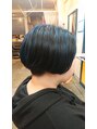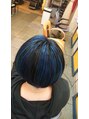 ツーブロックカット後、メッシュを束状に入れてダブルブリーチにてしっかり色を抜き その後全体的にブルーに染めました。自毛にもブルーが入りグレーぽい色味になりブルーに馴染む黒髪に仕上がりました。