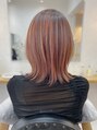 全体にハイライトをいれてコーラルブロンドでピレンジカラーに。レイヤーを入れる事で伸ばしかけでも変化を◎