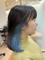 全体の地毛の黒髪にインナーの水色がかわいいスタイルです!根元は1回ブリーチの為少し濃いめの青で緑にならないように◎中間から毛先は数回ブリーチしているのでこのスタイルのような透明感のある水色を出す事ができます(^^)