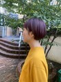 襟足ギリギリのショートボブスタイル!!ギリギリに切る事で、洋服とのバランスも合わせやすいですよ。カラーは、ラベンダーピンクなので可愛い服でもカッコイイ服もどちらでも合わせやすいですよ。^_^