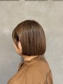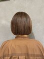 カットは襟足短めのミニボブです。内側を軽くしてスッキリ収まるようにしました。前髪はラウンドで、サイドバングに繋ぎました。カラーは明るめのベージュです。