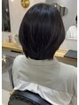 柔らかい髪質の直毛をコスメパーマで動きとボリュームを出しています。カットは前下がりショートで顔周りに長さを残しているので甘すぎずハンサムなヘアスタイルです。