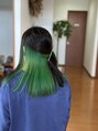 インナーカラーグリーン。ベースはダークグレーにしていますので、グリーンとの相性抜群です。広くないインナーカラーで、結べば目立ちにくいです。