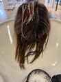 元々ハイライトが入ってらっしゃるお客様なのですが、そこらから全体に細いハイライト(シークレットハイライト)を入れ、水素カラーでオンカラー。ツヤと動きがしっかり出るスタイル。白髪もぼかせるし、一石二鳥です。