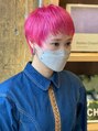 シャープなベリーショートにビビッドなピンクで仕上げました。髪の状態によってケアブリーチ1~2回です。