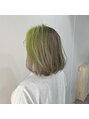 全体をブリーチして前髪部分のみライムグリーンにした派手髪スタイル。全体優しいグレージュがうまくまとめてくれます。