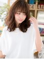 【スタイルは★ブックマーク★が便利】Aラインシルエットで小顔に見せたくせ毛風カールのふわミディ。暗髪の重めスタイルでも、透け感ある斜めバングで空気感と軽さを出して重軽MIXに。前下がりや耳かけも大人かわいい♪(メイク担当:北浦和店 棟方)