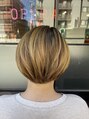 全体に細かめのハイライトを沢山入れて、根本が伸びてきてもオシャレなカラー。ミニボブは首周りがスッキリするのてわオススメです!