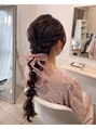 リボンで飾り付けた甘めの編みおろしアレンジ。