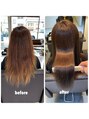 縮毛矯正毛にデジタルパーマやブリーチハイライトが入ってる状態。他店では縮毛矯正お断わりされ酸性縮毛矯正で検索されてご来店。ダメージで毛が切れており毛先が厚みがなく薄い状態。カラーも艶感が出る明るさに。GLTトリートメントでサン熱効果を与えた。