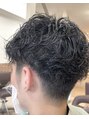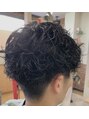 マッシュショートレイヤーのランダムパーマ。サイド・ツーブロック、バック・刈り上げでスッキリと。全体にランダムパーマで無造作な質感に。2トーン・ブルーブラックカラーで落ち着いた仕上がりに。