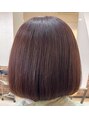 ローレイヤーのショートボブ。襟足の厚みを抑えてグラデーションカット。ラインは重めに仕上げ、おさまりよく。7トーン・ローズピンクカラーでツヤツヤな質感に。