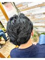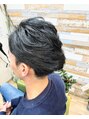 カット、wカラー。メンズスタイル。アップバングのツーブロック×刈り上げ。ケアブリーチで明るいベースを作り、濃いインディゴネイビーをオンカラー。透明感ブルーブラックカラーに。色落ちして明るくなってきても楽しめます。