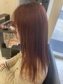 赤味強めのブラウン♪インナーが入ってたとこも綺麗に色が出て可愛い☆カットは揃えて毛量調整。顔周りは外に流せるように(^^)