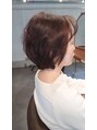 クセを活かしたショート。柔らかなクセが、女性らしさアップ。ほどよい明るさのまろやかブラウンで白い髪も綺麗に染まります。