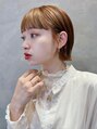 顎くらいの大人ショート、ミニボブ。オレンジベージュカラーで、透明感と柔らかい印象になれます。オイルバームを髪全体に馴染ませるだけのツヤ髪になれる簡単スタイリング。