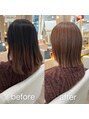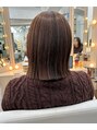 肩につく長さの切りっぱなしボブ。アイロンをしてオイルで仕上げています!癖が気になる方はストレートパーマもオススメです!カラーはAVEDAカラーのベージュカラーでなるべく明るめに仕上げています!ハイライトもプラスしてより明るく見せることができます