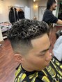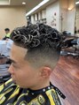 横後ろ0mm~はじまるグラデーション刈り上げ、スキンフェード。 トップもオールバックに流れるようにベースカットし、かなりハードめにパーマ。仕上げにブリーチ2回でハイライトを入れ、カラー剤で更に色を入れてホワイトメッシュに。パーマとの相性抜群。