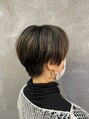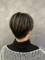 カットは、襟足は刈り上げしないギリギリの短さで、サイドは内側を短くし、上は耳にかかる長さにしたスッキリショートです。カラーはブリーチでハイライトを入れ、白髪ぼかしとしても効果的です。