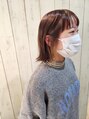 肩ギリギリラインのボブベース。前髪は眉毛ライン。もみあげはインナーカラーでベージュブラウンをオンカラー。