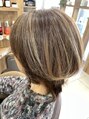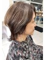 明るめのベージュベースの白髪染めと、ブリーチを使ったハイライトを20枚ほど入れた白髪ぼかしのヘアカラーです。明るく、やわらかい印象にしたい方におすすめです