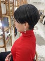 黒髪のハンサムショートにシースルーの前髪がポイント。前髪があるだけで少し柔らかい雰囲気のショートヘアに。首元は沿うぐらいの短さですっきりと仕上げてます。