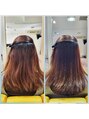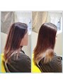 7ヵ月前に他店で縮毛矯正をされていて、カラーも月一でされていて中間~毛先は髪の毛に体力が無い感じでクセ戻りもある髪質でした。髪内部にアルカリ剤なども残留しているので施術前にアルカリ残留除去や髪質強化を計り酸性ストレートさせて頂きました。