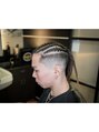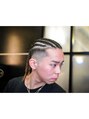 サイドとバックは、スキンフェードを施し、トップは地毛のみをオールバックに編み込んだコーンロウスタイル
