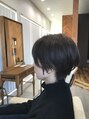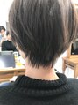 程よく後頭部の丸みを残したシャープな印象のショート。少し長めに残した襟足が首を長くスッキリ見せてくれます。顔まわりは無駄に長く残さず頬骨を生かす切り方をします。カラーについては、一回染めでできる限りオレンジ味を消した柔らかなベージュに。