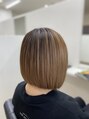 切りっぱなしの重ためボブ顎下の長さで設定フロント目に入らないぐらい、少しサイドに流す感じでカット