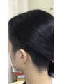 髪の状態を御説明させて頂きます。毛量→多い。癖 →波状毛やや強い。カラー→有りません。定期的に、御来店御座います1年間に2回縮毛矯正頂いております。毛量が多い為内側をバリカンで毛量を調整しています。