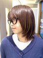 ミディアムヘアーにちょっと広めの前髪を作りそのつながりでレイヤーを入れて動きのあるスタイルになっています。前髪の広さ、レイヤーの入れる位置を少し変えるだけで印象がガラリと変わります。