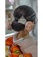 タイトなシニヨンで胡蝶蘭のヘア飾りを際立つようにして、金箔もさり気なく付けて華やかにしてあります。
