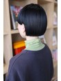 前髪をサイドまで一直線にワイドな前髪で繋げています。バックは襟足ぎりぎりのミニボブ。重めで乾かすだけで決まるスタイルです。