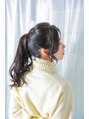 ゆる巻きのポニーテールにピンクベージュとつやリップで大人可愛い感じに。