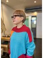 ワイドでミニなバング(前髪)が特徴的なボブワンブリーチオンカラーのアッシュベージュ